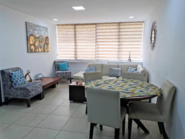 Este departamento amoblado y equipado, cuenta con sala, comedor, cocina con anaqueles altos y bajos, electrodomésticos y enceres de cocina, dormitorio master con walk in closet y baño, segundo dormitorio con closet y baño que comparte con visitas y área de lavandería.
